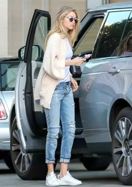 Gigi另外一件米色针织衫,宽松的袖口、破洞牛仔裤和白球鞋,舒适又随性的装扮。▼