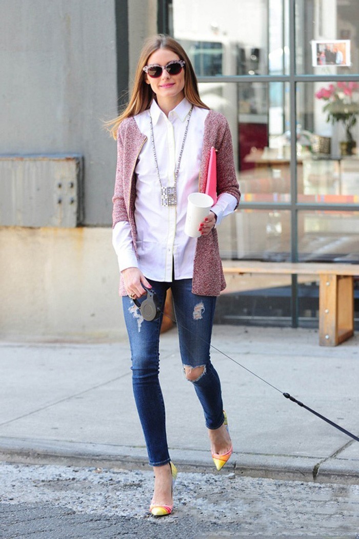 Olivia palermo针织外套+白衬衣+紧身牛仔裤,亮色的高跟鞋和包包都是点睛之笔。▼