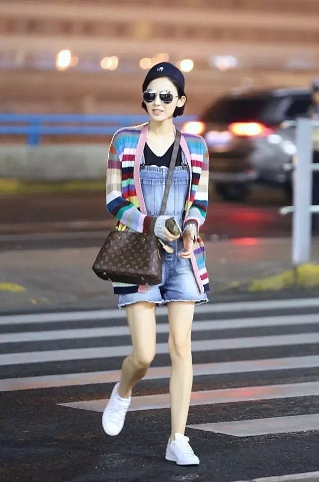古力娜扎彩色针织外套,背带裤和鸭舌帽都很减龄,小白鞋也是很好的选择~▼