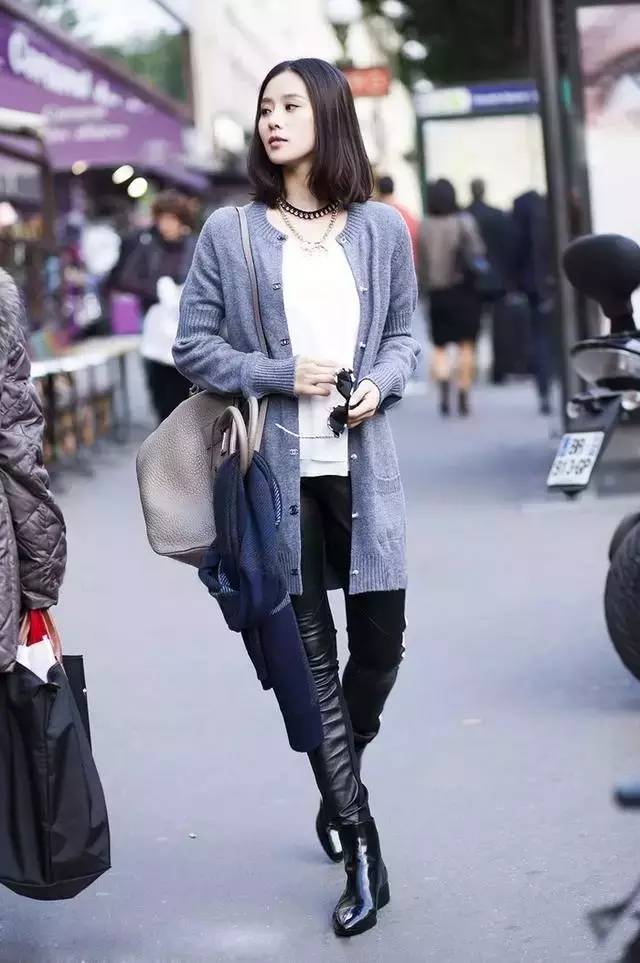 刘诗诗灰色中长款针织外套,搭配皮裤短靴,增加了气场和酷劲。▼