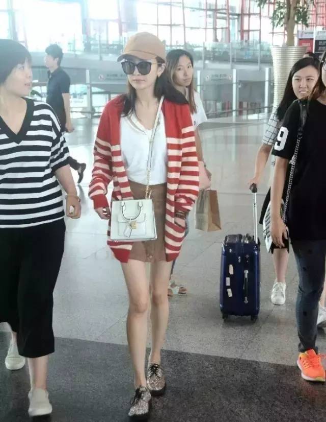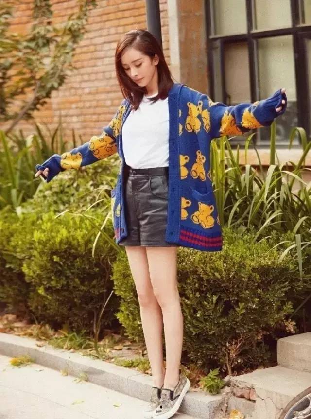 国内的爆款女王杨幂也少不了几件针织外套,大幂幂喜欢中长款的,刚好和里面穿得短裤或短裙长度相仿,背面看就成了“下衣失踪”啦。▼