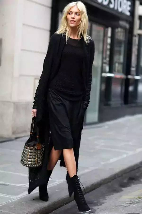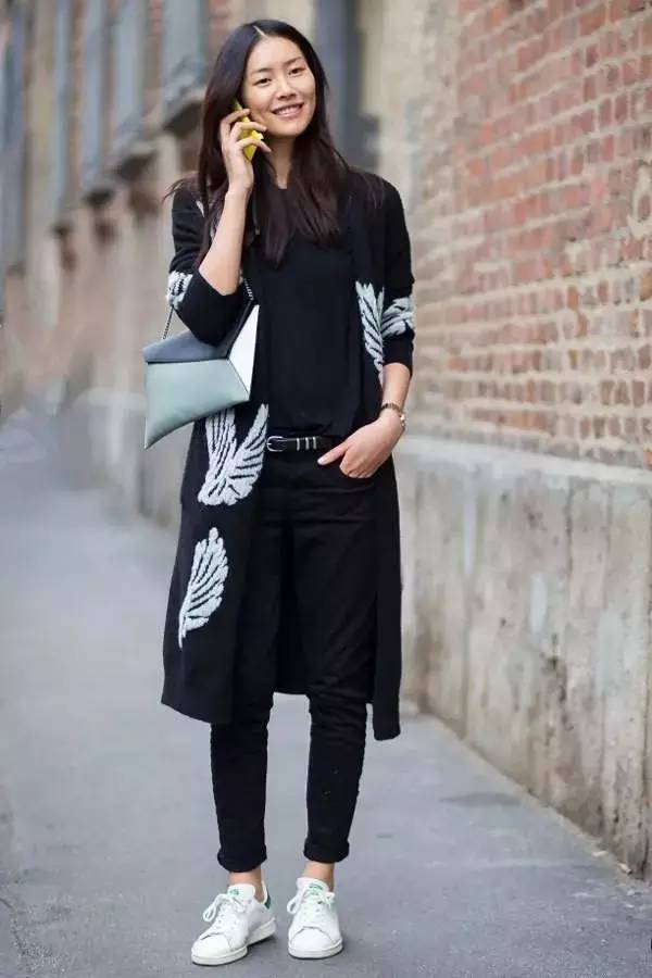 刘雯一身黑色LOOK虽然看上去很简单,但黑色长款针织外套上的印花增加了不少活力,小白鞋也大大的加分。▼