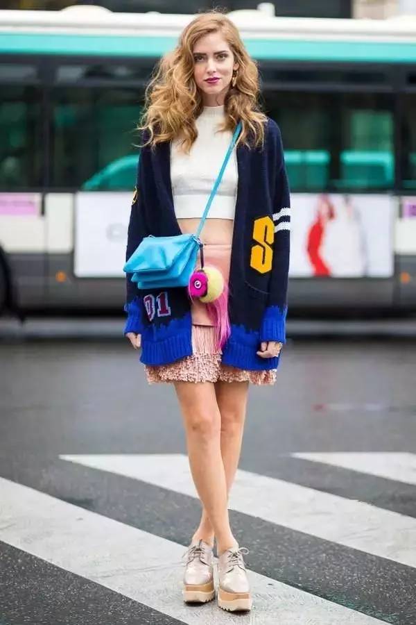 宇宙第一时尚博主Chiara Ferragni总是有把多种色彩搭配的恰到好处的能力,crop top和迷你短裙都让身材比例看起来更好。▼
