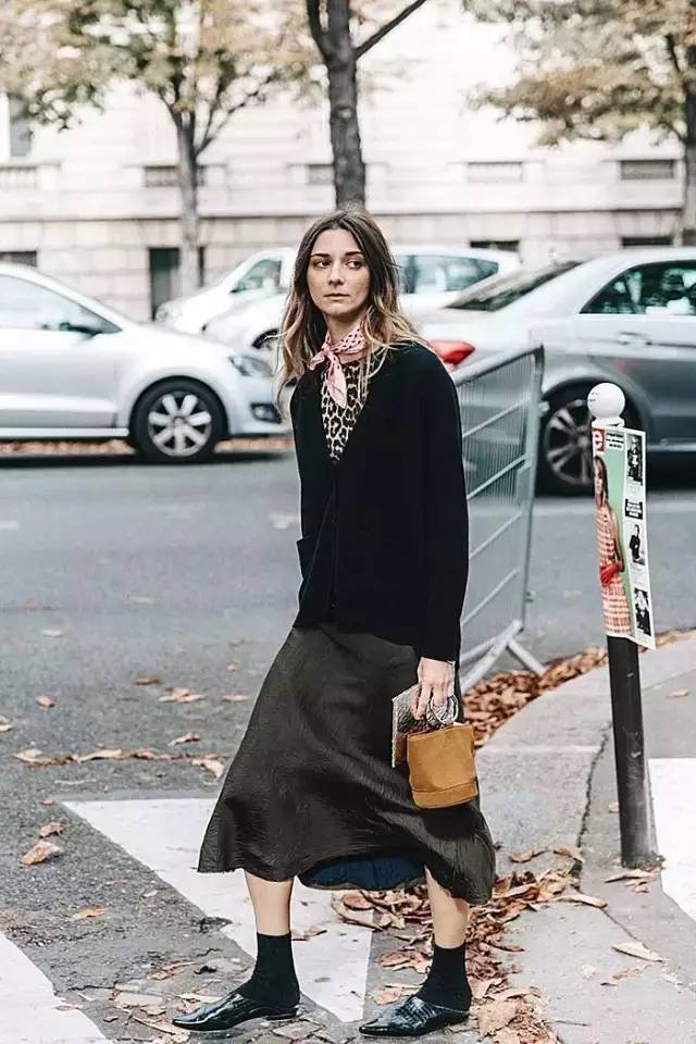 针织外套搭配短裙,重点当然是在露腿啦,秋天搭配一双乐福鞋也是相当机智的。▼