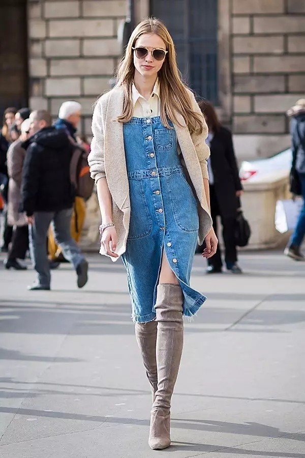 裸色针织外套,搭配背带裙和长靴,注意扣子不要全扣,制造开衩裙的效果。▼