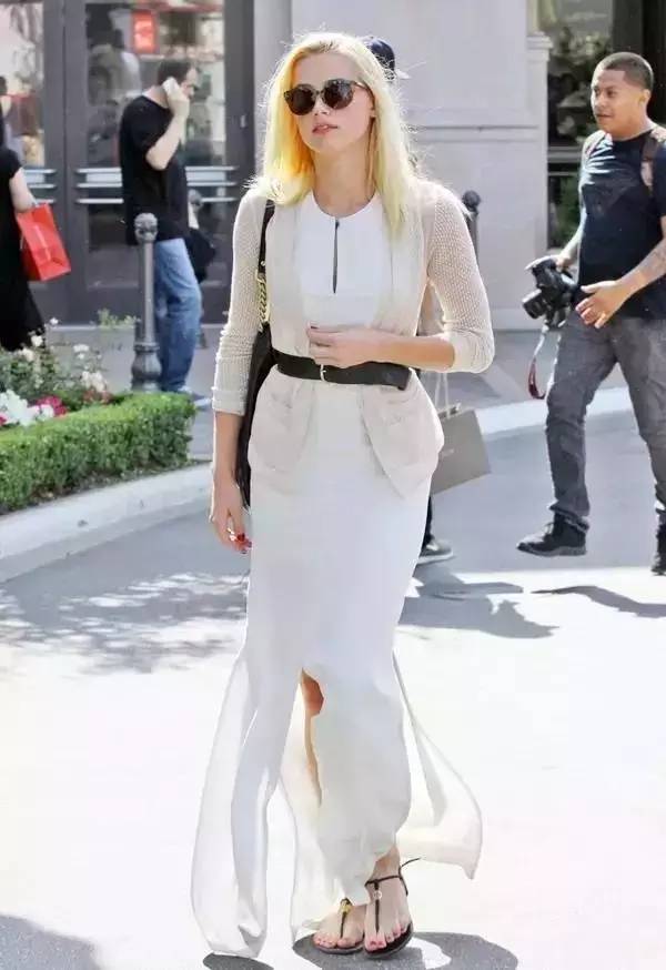 霉霉白色针织衫搭配镂空连衣短裙,长腿优势立即显现,也很甜美。▼
