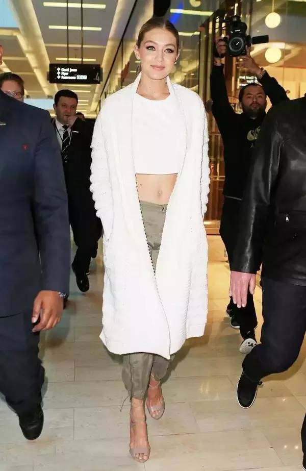 Gigi粗针钩花针织外套搭配白色crop top,露出蛮腰小露性感。▼