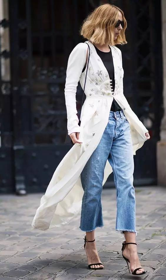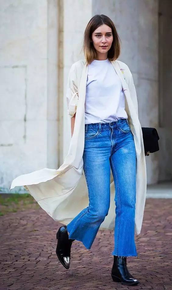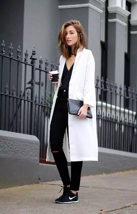 这种开衫也是由西装演变过来哒~留下了西装的小折领,比风衣款开衫的大折领更加硬挺帅气~白色的气质非常好~不要害怕会变成医生白大褂的即视感!搭配简约的黑色单品,时髦的很~▼