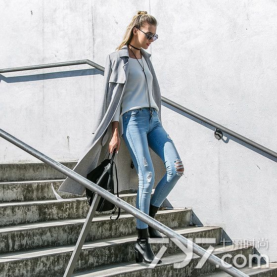 灰色大衣内搭白衬衫+牛仔裤也很清新时髦,秋季或初春都很适合,冬季换成白色毛衣也能带来同样的时髦气质。