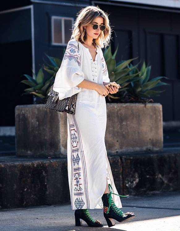 夏天,长裙搭配绑带凉鞋或一字带细高跟,有韵味。