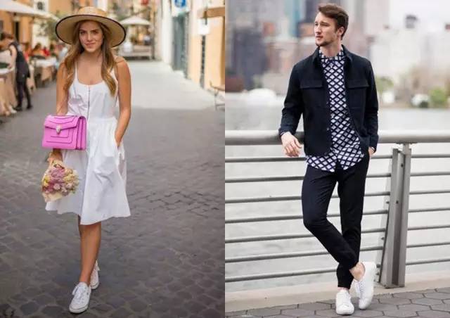 最简单的搭配就是大面积的黑白配啦,完全不用想,穿上白鞋就可以出街了。穿白色的女孩注意细节上要增添点活力,例如配饰上的包包、度假草帽都很好的打破白色的沉闷,至于男士当然不能全黑了,以黑色为主色,衬衫可以是黑白条纹、格纹这样搭配就不会沉闷不欢啦!