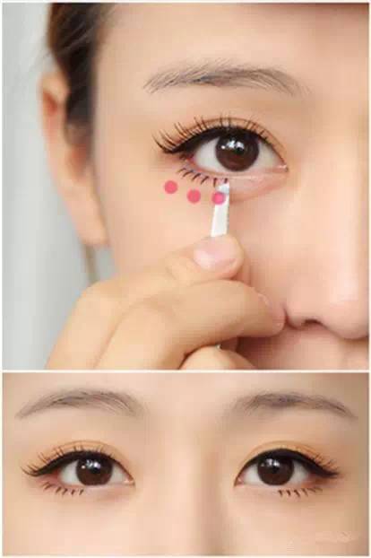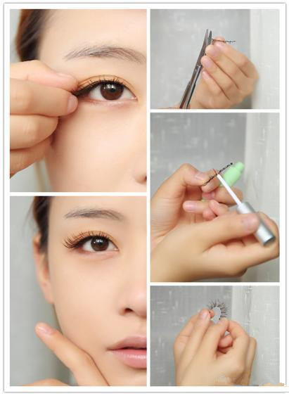 粘贴之前,一定要先根据自己的需要修剪睫毛长度。涂上睫毛胶水后,弯曲假睫毛稍等10秒左右,这样既能让睫毛胶到达最好的粘度状态,又能使睫毛具有自然的弯曲弧度,根据之前所画眼线确定的位置,紧贴睫毛根部粘上假睫毛,贴好后要轻轻往上推一推以防睫毛贴得太垂。PS:睫毛贴上,眼睛瞬间就不一样了。