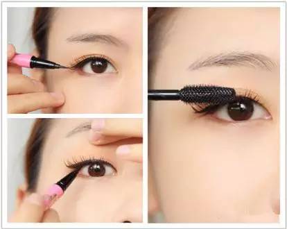 用眼线液笔补画完整的上眼线,不要忘记内眼线哦。然后用睫毛膏将自己的睫毛与假睫毛刷到一起。