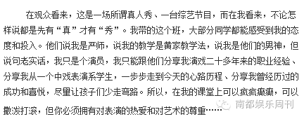 套用黄志忠在信中给“一年级”的学生们说的话:”表演是一门艺术,但它并没有固定的尺度。什么是好的表演?在我看来,所有能呈现出的文艺形式,一定是美学态度和哲学思考的出口。哲学指导美学,美学指导文学“