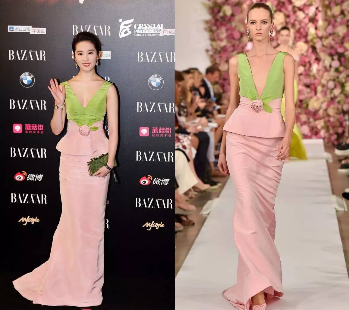 刘天仙选择的礼服很挑人,抹茶绿和樱花粉撞一起也是real刺激,然后就有网友表示当晚的刘亦菲很像一个...寿桃。