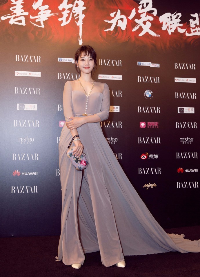 女明星也并不是都穿裙子,比如白百何就穿了条连体裤,来自Georges Hobeika,但是依然有仙女裙的气质,烟灰紫本身就自带浪漫特效。
