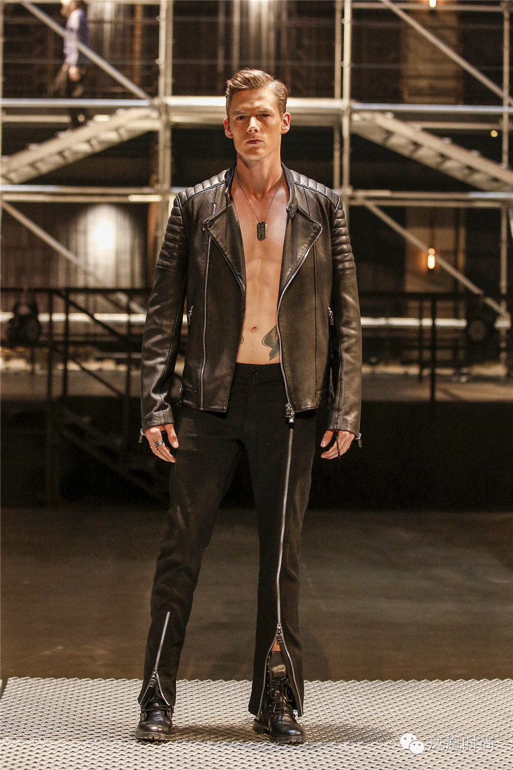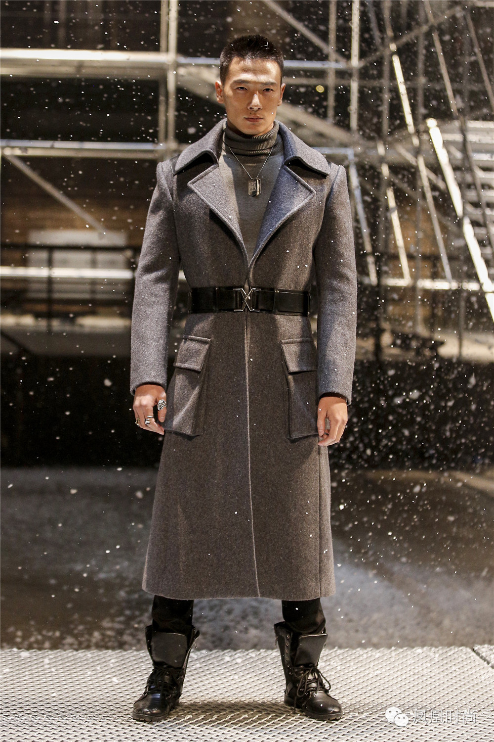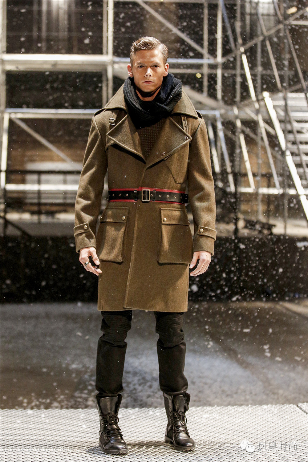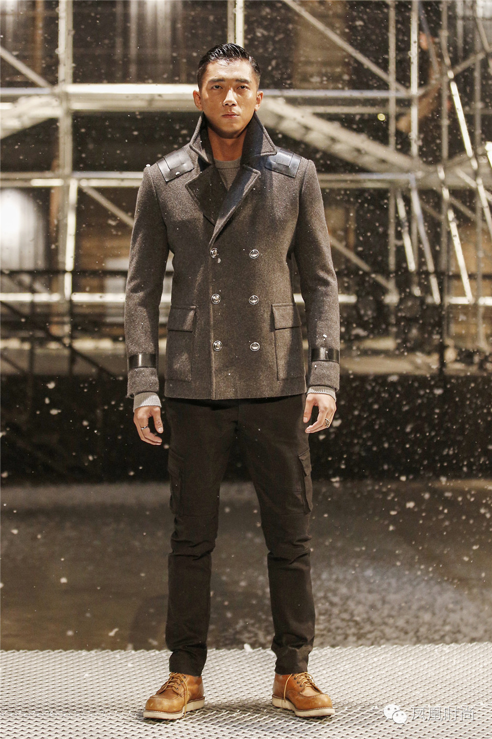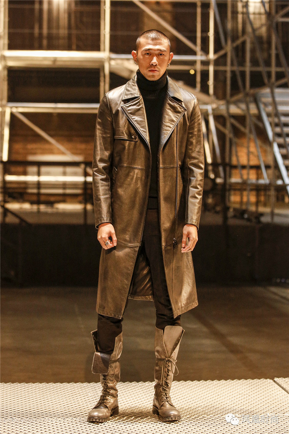 先来看看秀场布置,在都市丛林衬托的背景下,建筑硬材、车辆招牌、钢筋水泥营造出浑然天成的工业感;型男模特穿梭其中,型格飒爽引人瞩目!