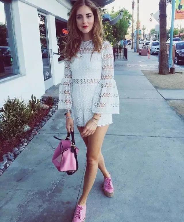 白色连衣裙搭配粉色鞋子、包包,博主Chiara Ferragni少女心爆棚啊~整身搭配整体感十足,甜美又有女人味~