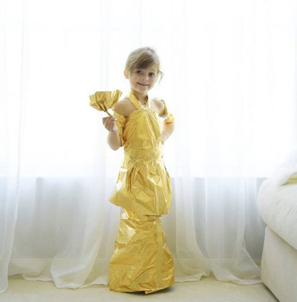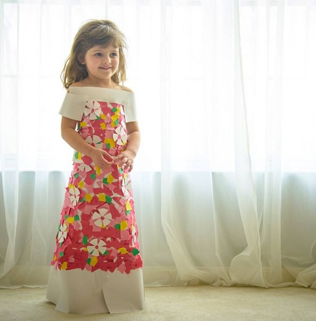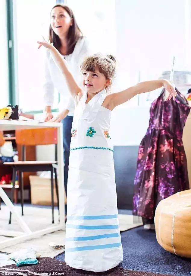 当场选定配饰粘贴成花状图案制作出这款纸裙子