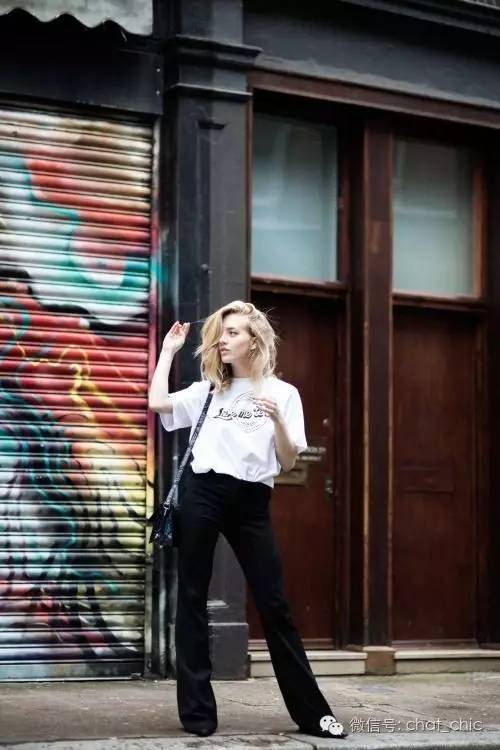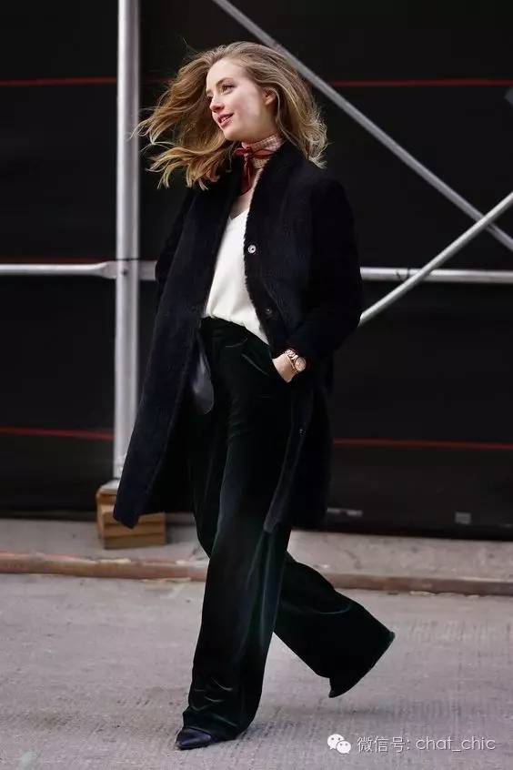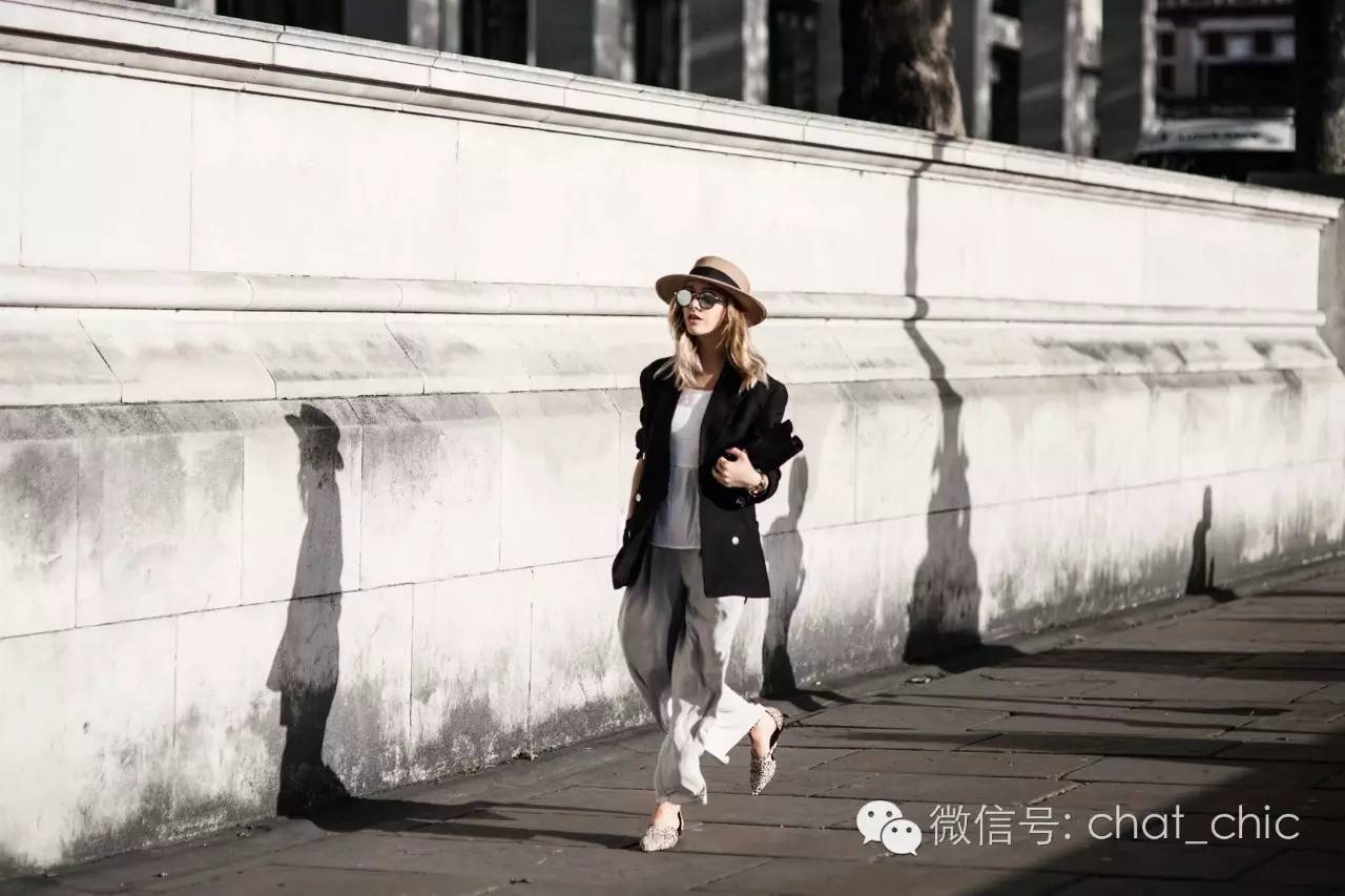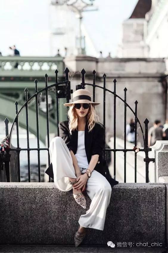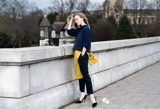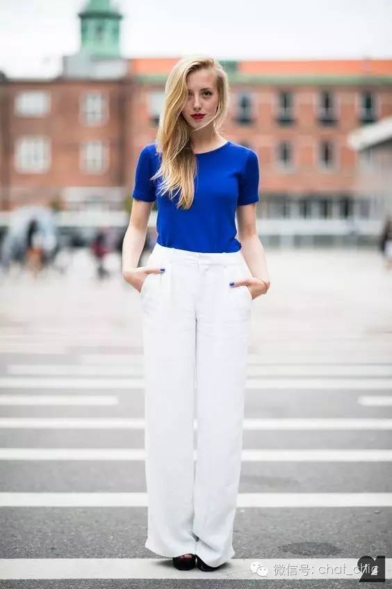 臀围往往最容易出卖本身的上下身比例,Sarah聪明地选择了稍微宽松的直筒长裤,材质得是有垂坠感、不贴肤,这样无论站立还是走起路来摆动着,线条都是笔直的,拉长效果就出来了。这时,上衣就得修身纯色,材质比裤装更轻盈些。