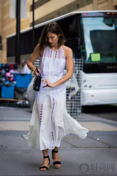 今年挂脖式的连衣裙又开始流行起来,白色镂空的款式适合度假穿着。