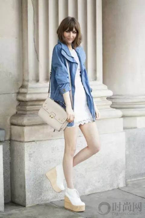 白色蕾丝连衣裙+蓝色工装外套,清爽休闲范儿。