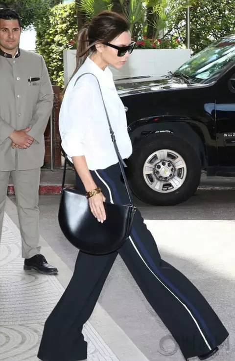 白衬衣搭配侧边条纹阔腿裤让贝嫂穿出来气场也是爆表的节奏。