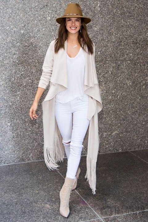 乳白色的流苏底摆斗篷式外套+同色系短靴,时髦又帅气。
