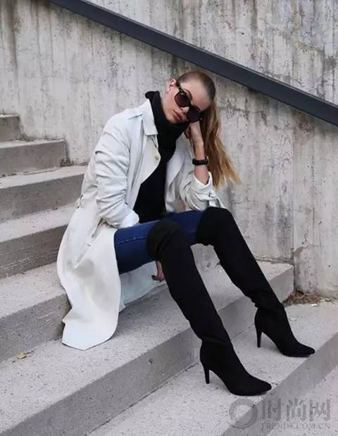 乳白色风衣外套+黑色过膝长靴,霸道女总裁的即视感立现。