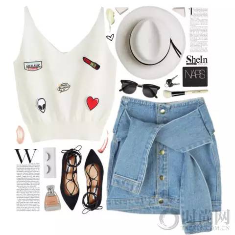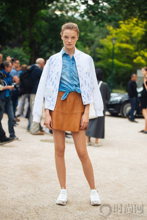 浅蓝色牛仔衬衣把前门襟打个结立刻变得与众不同,搭配黄棕色短裙把复古风情带入整个look,肩披白色印花外套青春减龄。