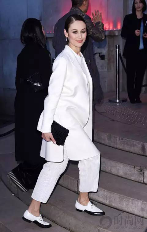 白色西服外套搭配白色细纹九分裤穿出套装的统一感,黑白拼接的尖头平底鞋的加入彰显率真的个性。