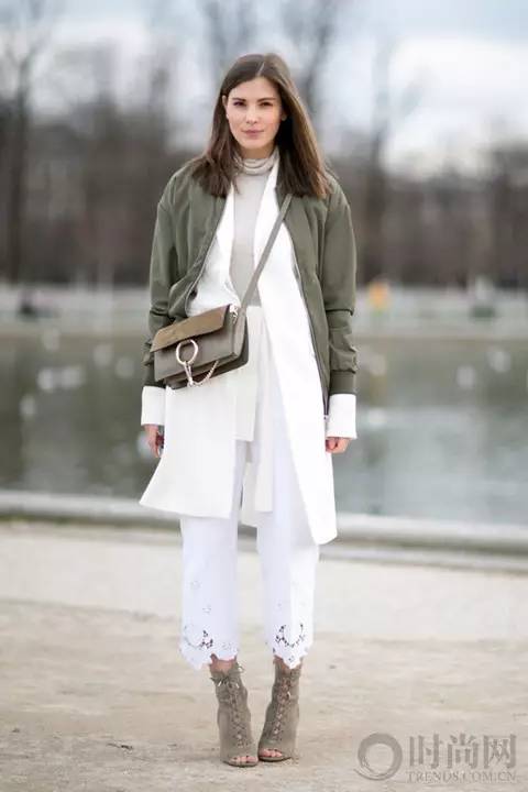 白色大衣在秋日显得格外清新动人,蕾丝边九分裤女人味十足,外套橄榄绿色棒球服平添了一份帅气。