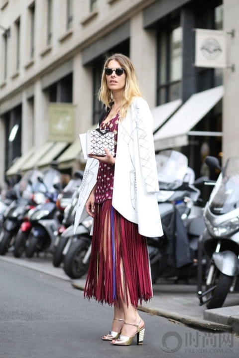 酒红色流苏裙灵动又性感,肩披白色外套轻松凹出时尚造型,气场更是直接爆表。
