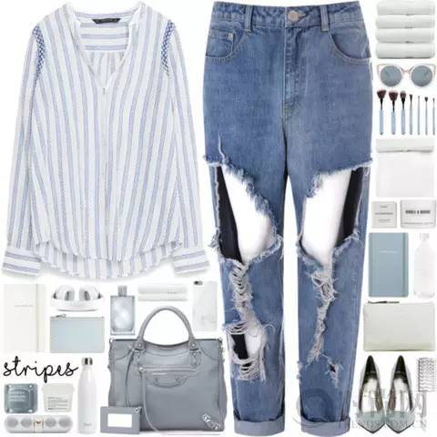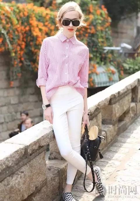 粉白条衬衣配白色牛仔裤 很适合夏末初秋,有小小的甜美风格,这个季节就应该穿这样的浅色。