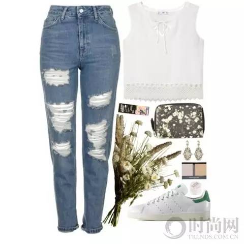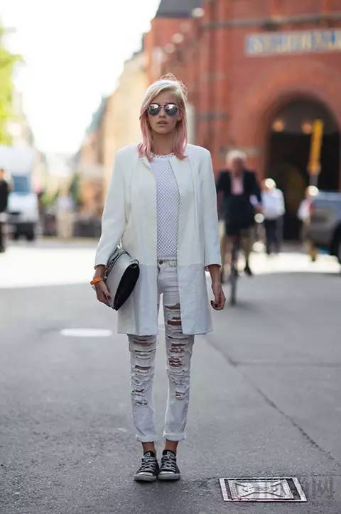 极简风,一身白色都能穿的很有细节,白色破洞牛仔裤就是点睛之笔。