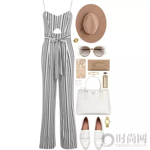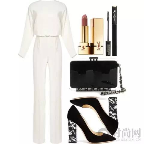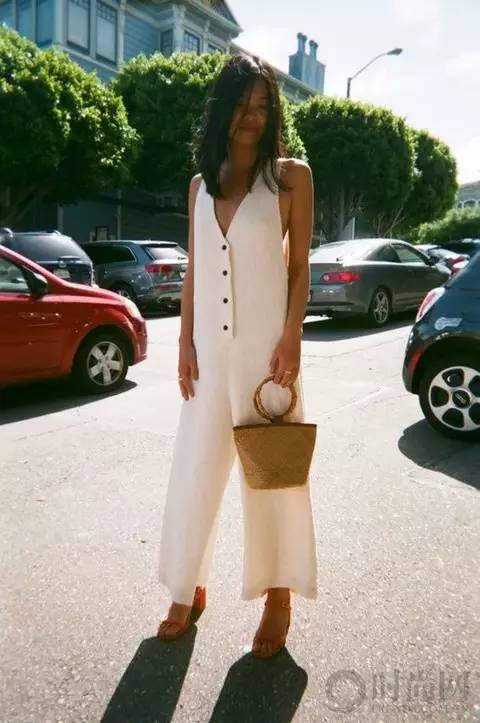 白色无袖连体裤清爽摩登,一字方跟凉鞋和编织的手拿包都让整个look时尚升级。