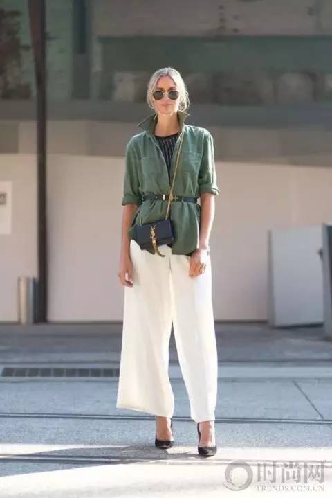 橄榄绿衬衫+白色阔腿裤通过系扎的腰带穿出九头身超模身材,时装精最爱的迷你包点缀让整个look多了份俏皮。
