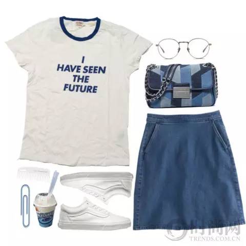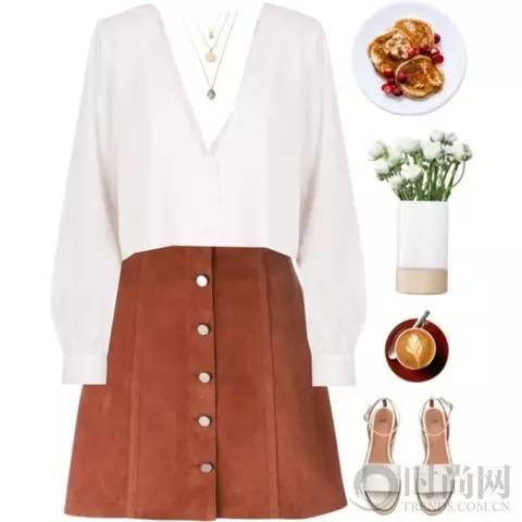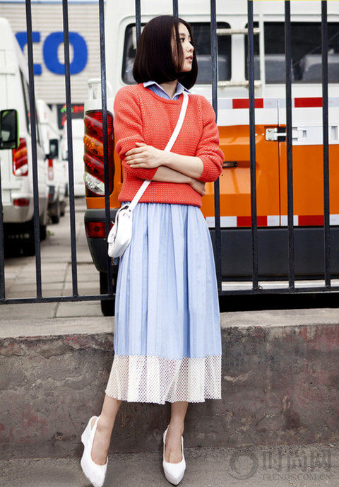 基本款白衬衣搭配高腰伞裙既有邻家妹妹的小清新味道又有都市OL的干练,让你上班或者约会都能轻松hold住。