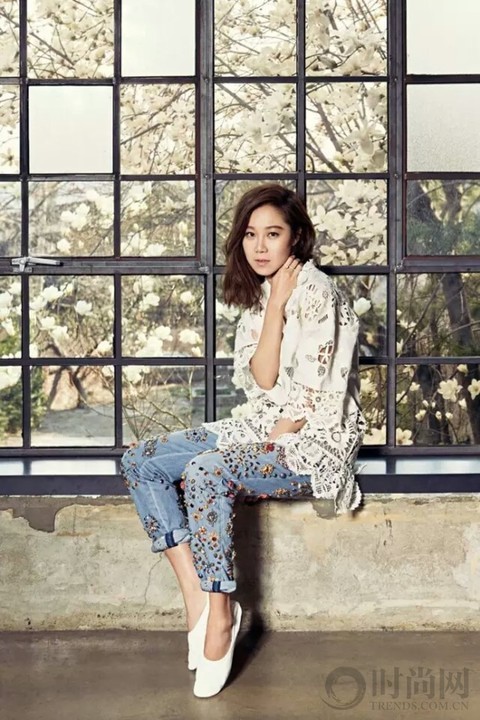 在这张画报中孔孝真欧尼选择白色镂空上衣+彩色钉珠牛仔裤+白色浅口平底鞋,与窗外玉兰花有相得益彰的效果。