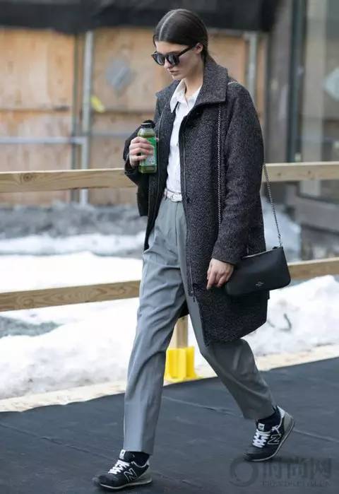 中性的装扮模糊了性别的界限,白衬衣、灰色西服裤搭配深灰色外套,随性又帅气。