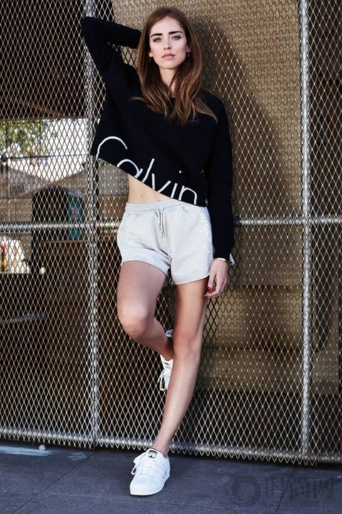 Chiara Ferragni,宽松的黑色上衣+白色短裤+白色板鞋。舒服休闲又很耐看。