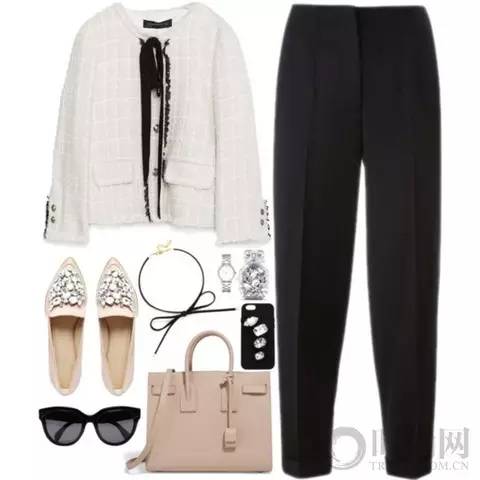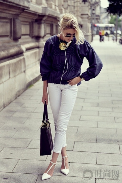 造型感十足的上衣,低调而充满了时尚感,再配上复古的白色尖头鞋,小脚裤,拎上干练的包包,时尚OL造型非常吸引人。
