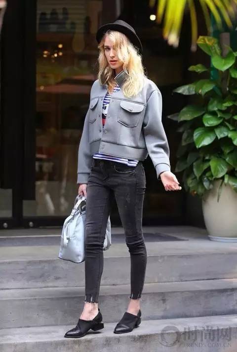 灰色双口袋短款夹克外套,蓝色条纹米奇长袖T恤,灰黑色仿旧小脚裤,黑色尖头拼接平底鞋灰白色软皮单肩包。