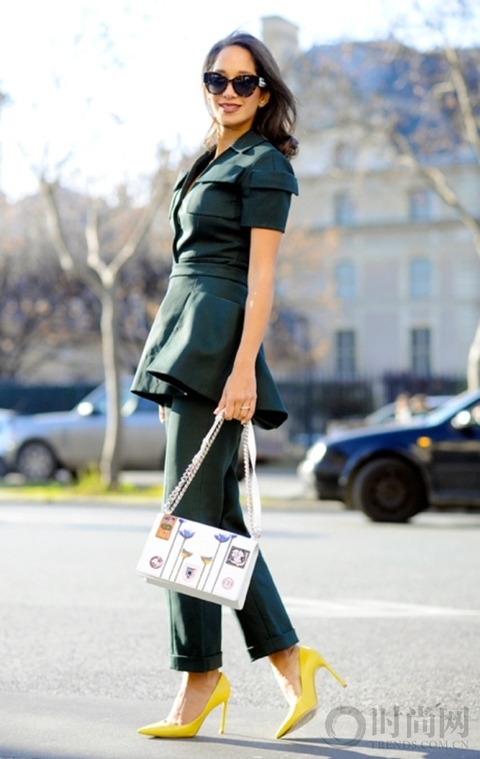 墨绿色组合非常显示品味,搭配亮黄色细跟鞋摩登有范,白色印花链条包更添女人味。