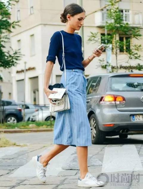 透气性良好的藏蓝色薄衫在夏日穿着并不会很热,蓝白牙签纹半裙衬托出精致优雅,小白鞋和白色单肩包都让整个look更加清新动人。