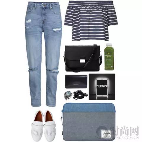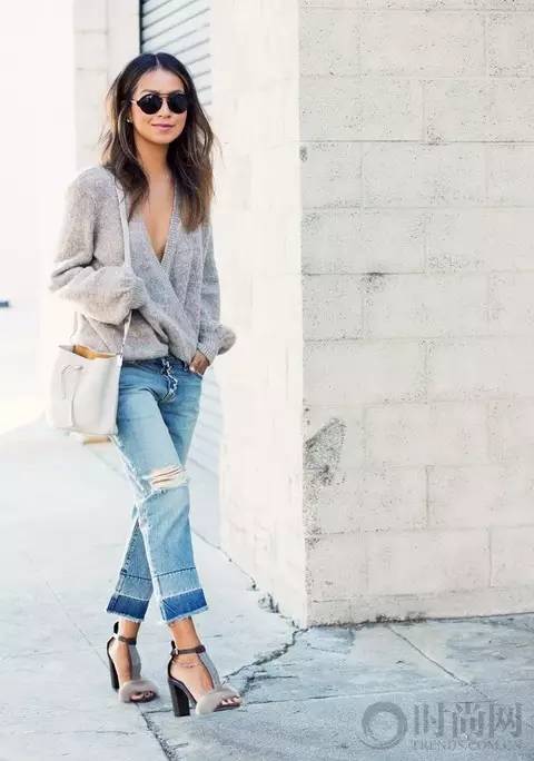 灰色针织衫+拼接毛边牛仔裤即使在夏天也可以穿着,白色水桶包让整个look更加清新动人。