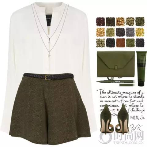 白衬衣+拼接印花半裙+军绿色夹克,是帅气优雅随性最好的mix,棕色绑带细跟鞋与裙子上的色彩呼应得相得益彰。