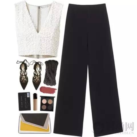 白色抹胸上衣搭配高腰宝石蓝阔腿裤尽显现代摩登女郎气质,小露香肩性感升级,手拿白色链条包更是气场十足。