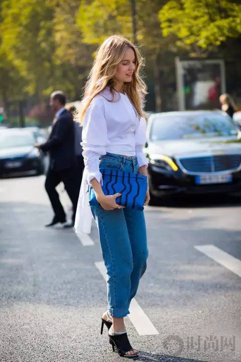 蓝白条纹衬衣塞进mom jeans简约而不简单,白色尖头鞋更加凸显干净大方的OL气质。
