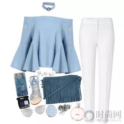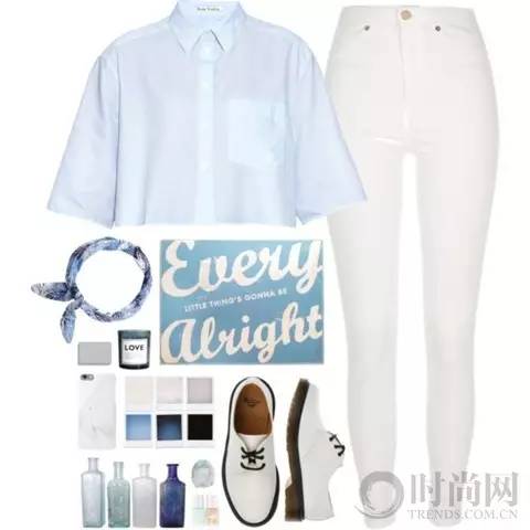 浅蓝色衬衣+白色毛边九分裤演绎夏末小清新,巧克力色背包给整个look加入复古味道。